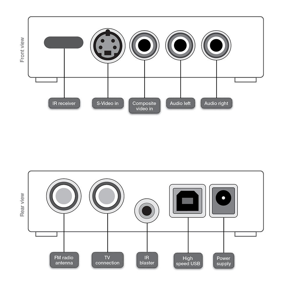 - WinTV-HVR-1955 USB 2.0 external box, with built-in IR receiver, MPEG-2 hardware encoder and composite video, S-Video and stereo audio inputs